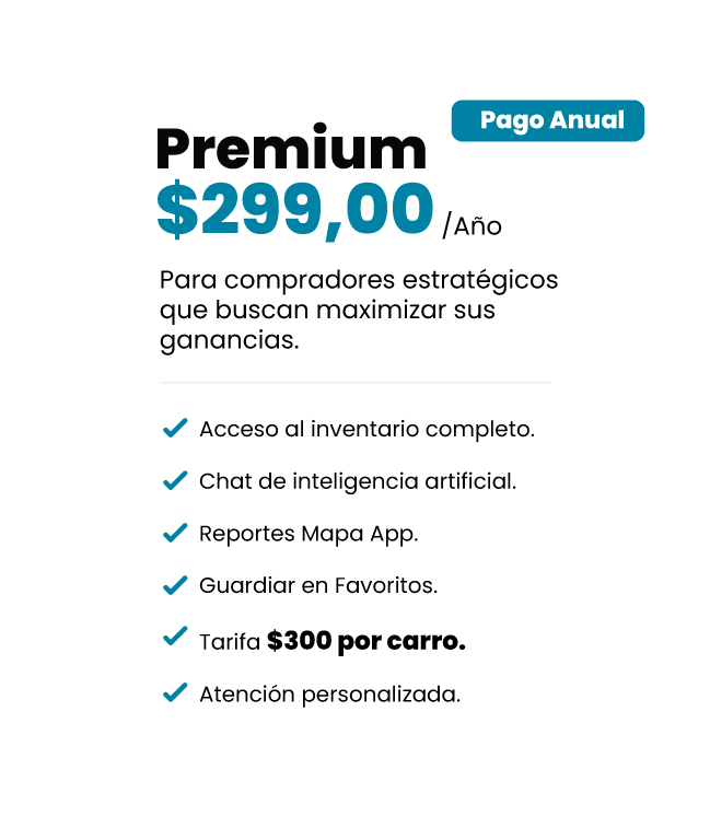 Conviértete en Revendedor y accede a distintas subastas con tarifas mas bajas (Requiere suscripción anual de $1000).